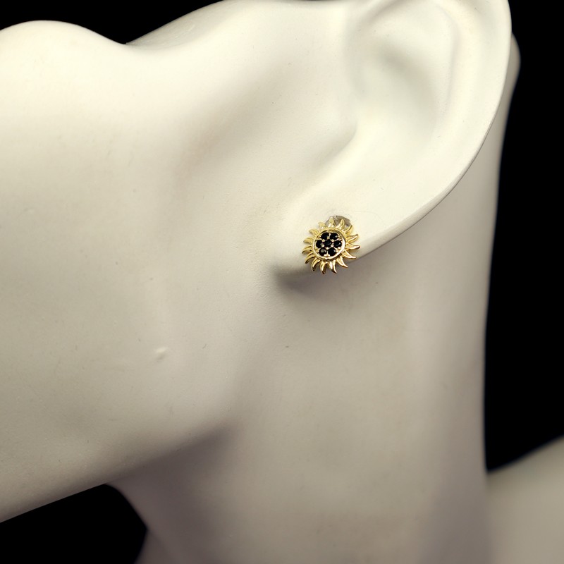 Sunflower Black Cubic Zirconia Stud Earrings Gold Plated Sterling Silver